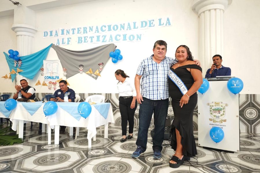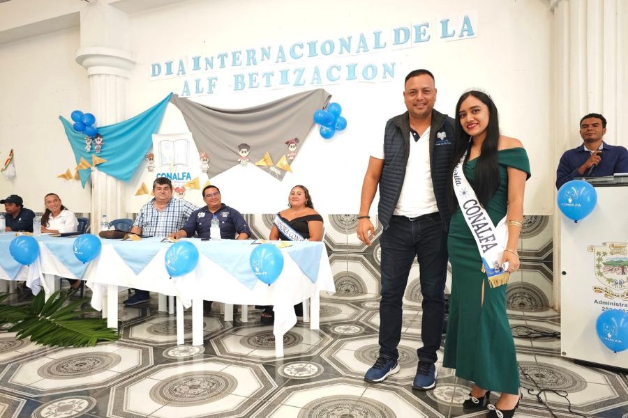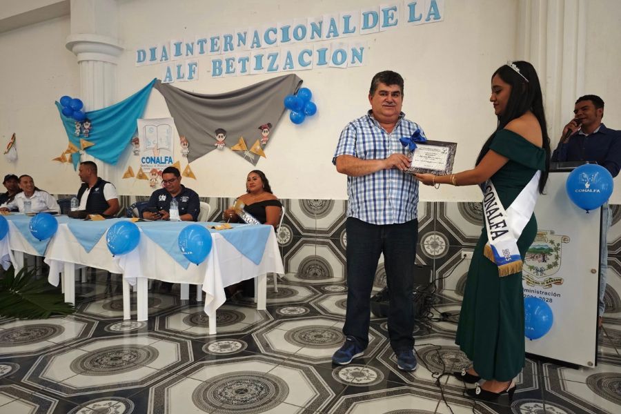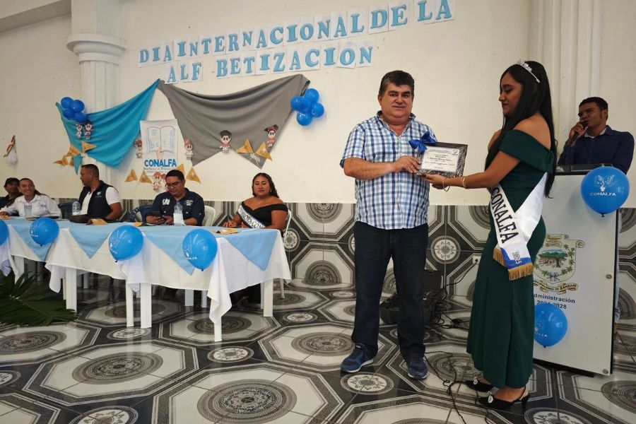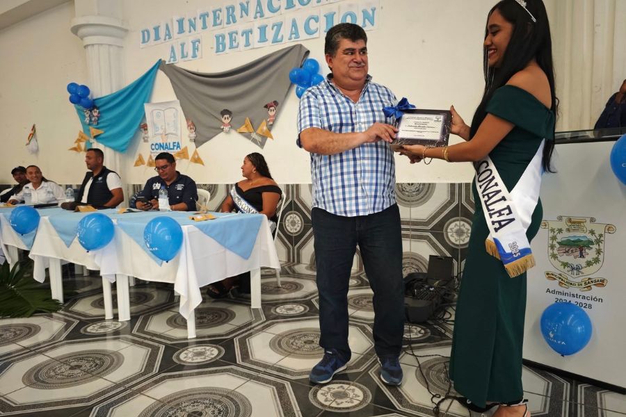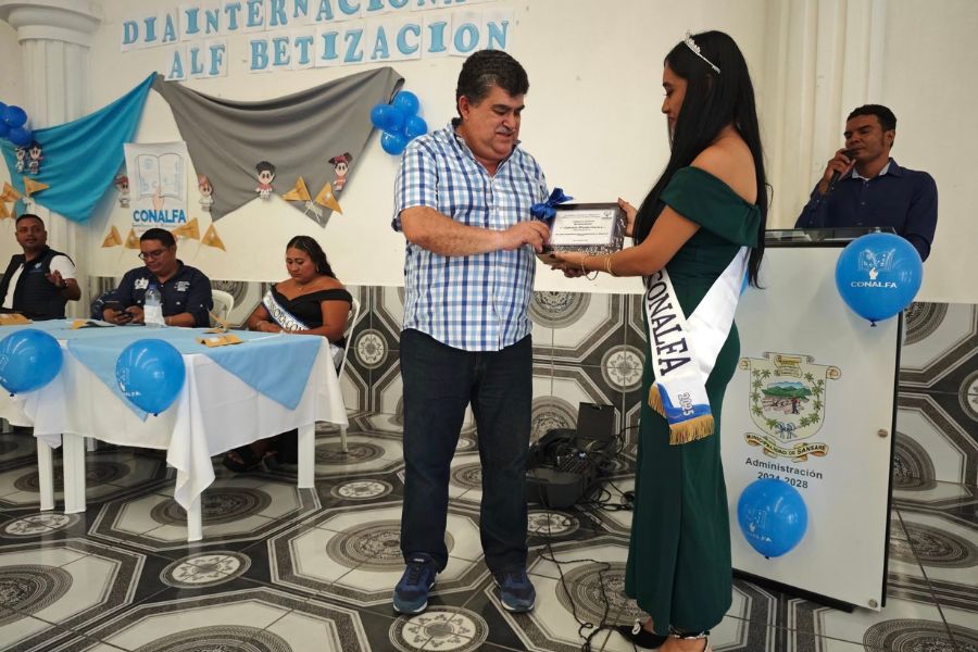 Como parte de la ceremonia, el señor alcalde coloca la banda a la señora y al señor CONALFA, así como al profesor Carlos Téllez, quien representa a CONALFA en el municipio de Sansare. Además, CONALFA otorga un reconocimiento al señor alcalde por su constante apoyo a la educación.